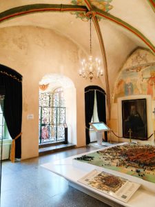 Interesująco wygląda Sala Rajców, do której prowadzi późnogotycki portal z napisem: „Szczęśliwe miasto, które w czasie pokoju obawia się wojen”.